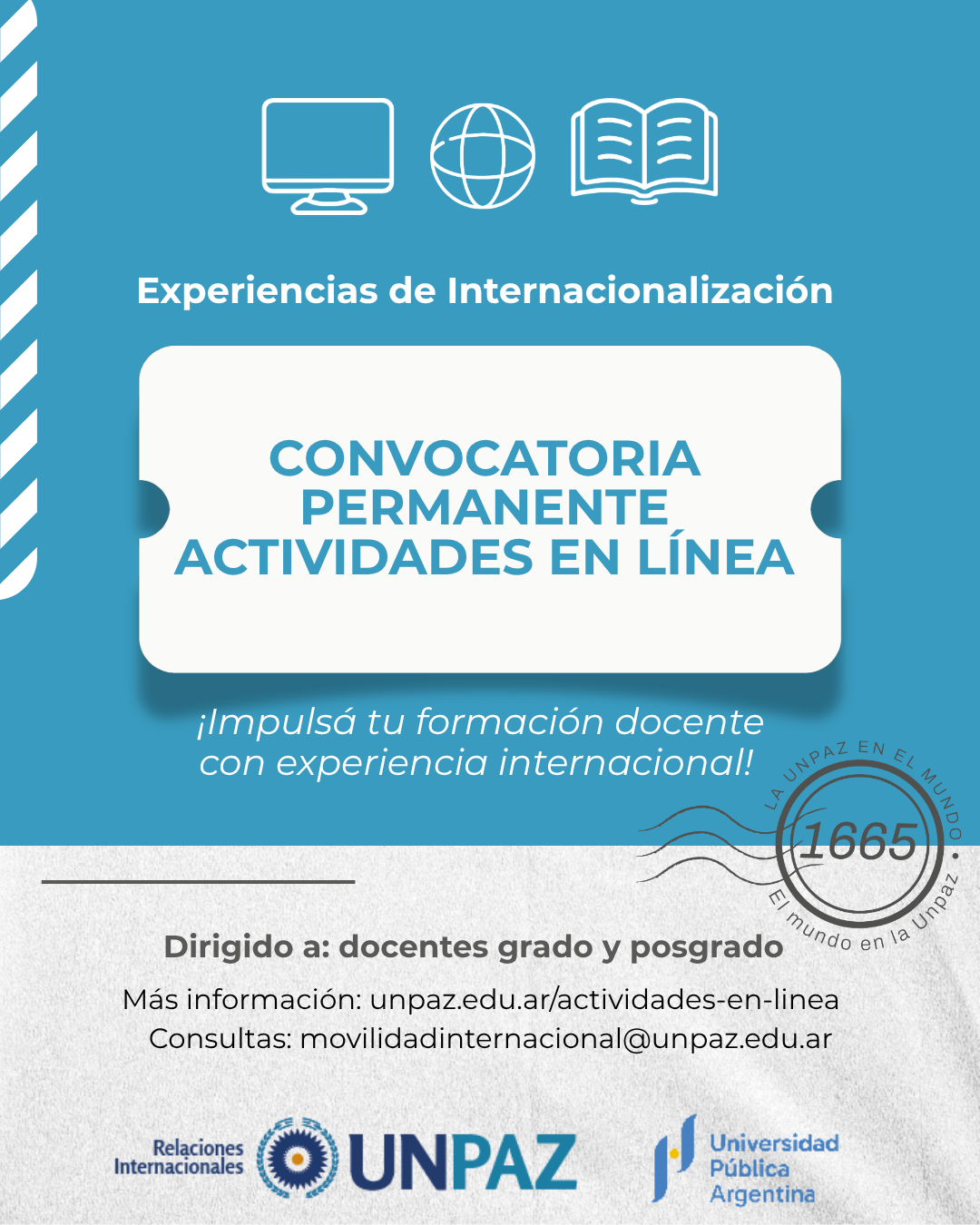 La UNPAZ, a través de la Dirección General de Relaciones Internacionales, convoca a docentes de grado y posgrado de la universidad a postularse a la "Convocatoria permanente de actividades en línea". Este proyecto es una estrategia que forma parte del Programa de Internacionalización Integral y Cooperación Internacional por medio de la internacionalización en casa y desde casa.