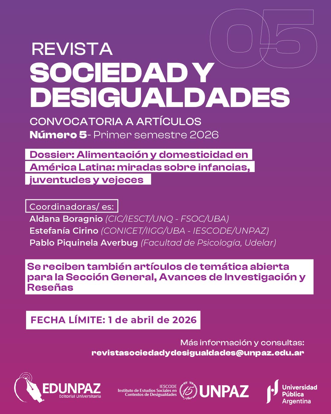 La UNPAZ, a través del Instituto de Estudios Sociales en Contextos de Desigualdades (IESCODE), convoca a la presentación de artículos para integrar el quinto número de la Revista Sociedad y Desigualdades, que se publicará durante el segundo semestre del año 2026.