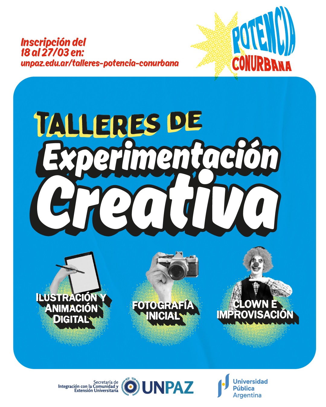 La UNPAZ, a través de la Secretaría de Integración con la Comunidad y Extensión Universitaria, informa que del 18 al 27 de marzo se abre la inscripción a Talleres de Experimentación Creativa desarrollados en el marco del proyecto Potencia Conurbana.
