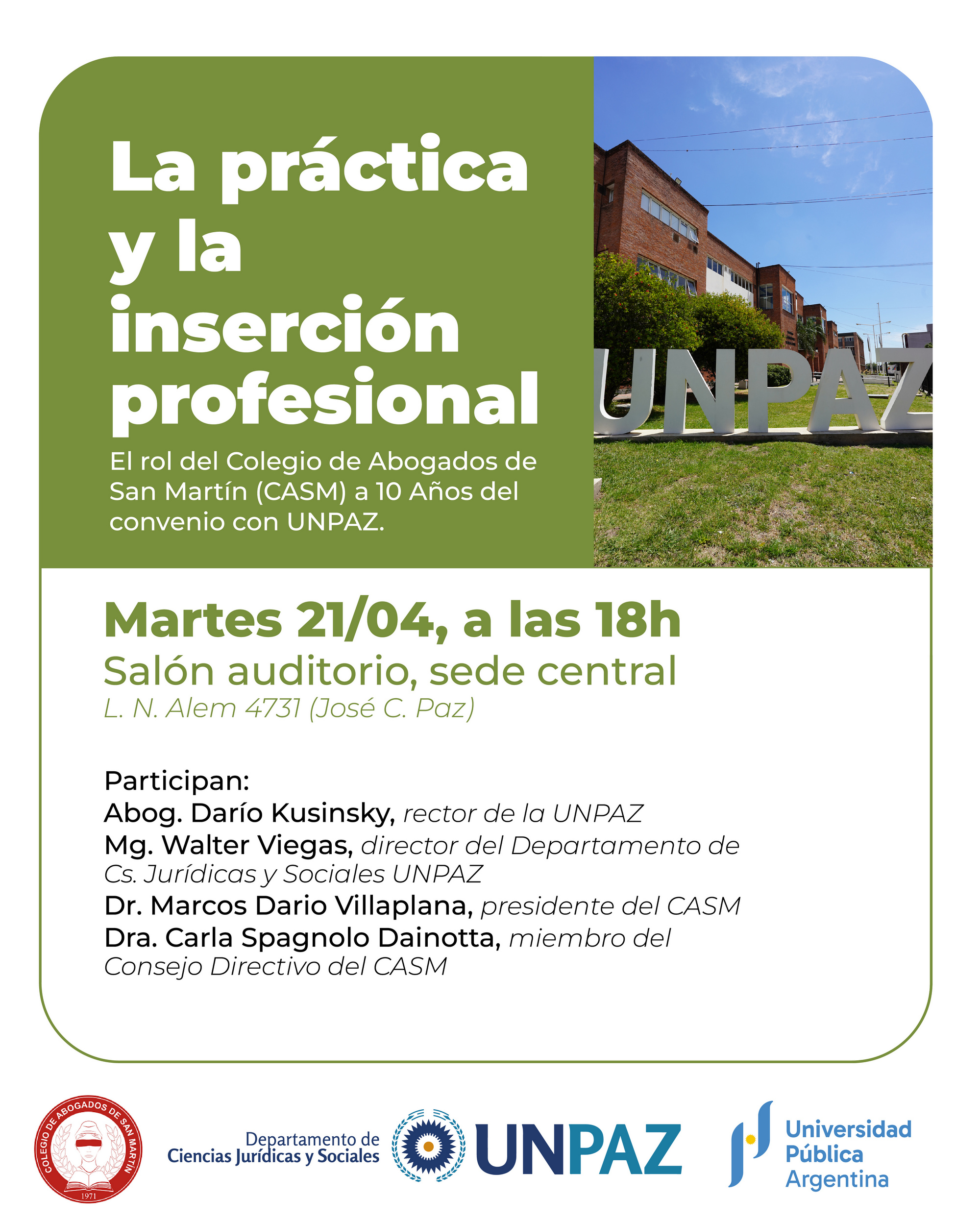 La Universidad Nacional de José C. Paz (UNPAZ) invita a la comunidad a participar del encuentro “La práctica y la inserción profesional. El rol del Colegio de Abogados de San Martín (CASM) a 10 años del convenio con UNPAZ”, que se realizará el martes 21 de abril a las 18 horas en el Salón Auditorio de la sede central (Leandro N. Alem 4731, José C. Paz).