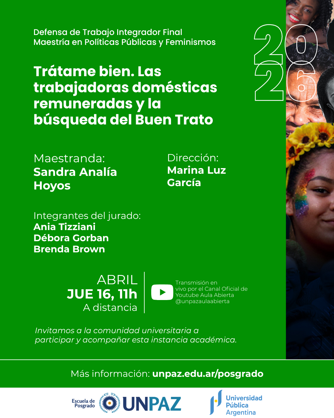 La defensa se realizará a distancia y será transmitida en vivo a través del Canal oficial de YouTube UNPAZ Aula Abierta, para que toda la comunidad académica pueda acompañar la actividad.
