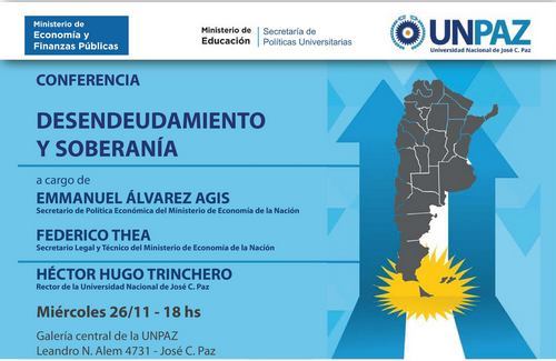 En el marco del Ciclo de Charlas sobre “Desendeudamiento y Soberanía”, el Secretario de Política Económica, Emmanuel Álvarez Agis y el Secretario Legal y Administrativo del Ministerio de Economía de la Nación, Federico Thea, brindarán una conferencia en la Universidad Nacional de José C. Paz (UNPAZ) sobre los aspectos salientes en materia legal y económica de la negociación que encara el Gobierno Nacional frente al reclamo de los fondos buitre.