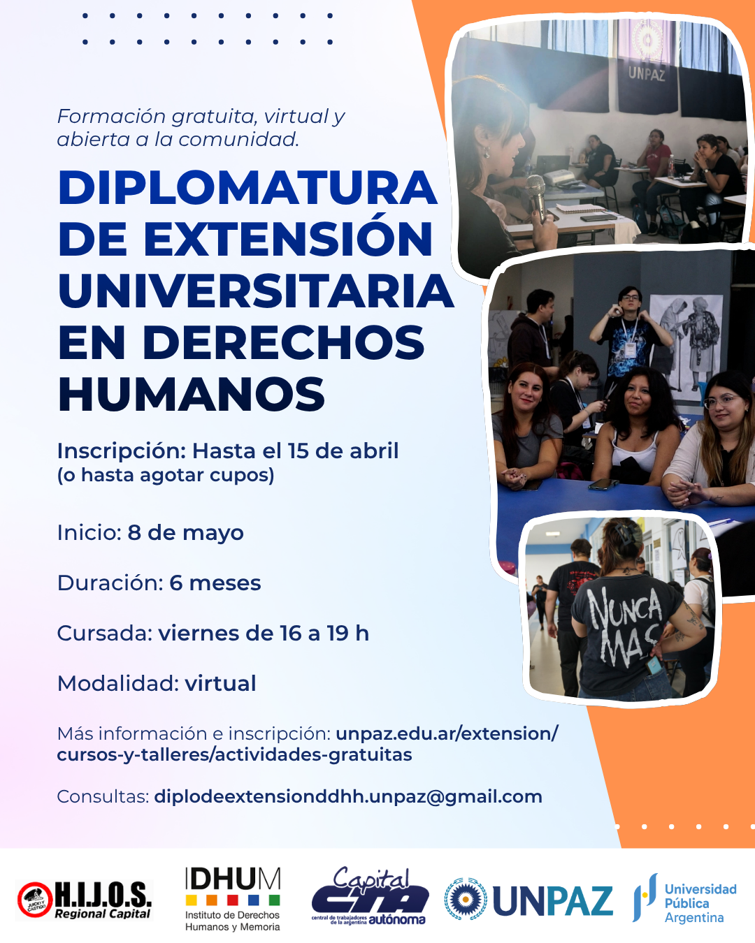 La Universidad Nacional de José C. Paz (UNPAZ), a través de la Dirección de Extensión y Voluntariado Universitario, informa la apertura de inscripción a la Diplomatura de Extensión Universitaria en Derechos Humanos, una propuesta de formación gratuita, virtual y abierta a la comunidad. Las personas interesadas podrán inscribirse hasta el 15 de abril o hasta completar el cupo disponible, a través del FORMULARIO online.
