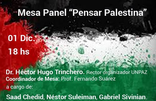 En el marco del Año Internacional de Solidaridad con el Pueblo Palestino, la UNPAZ ha invitado a tres referentes de la temática para presentar el Panel “Pensar Palestina”: Saad Chedid es titular de la Cátedra de Estudios Palestinos “Edward Said”, de la que el Lic. Gabriel Sivinian es docente y Néstor Suleiman es Secretario General de la Confederación de entidades Argentino-Árabes.