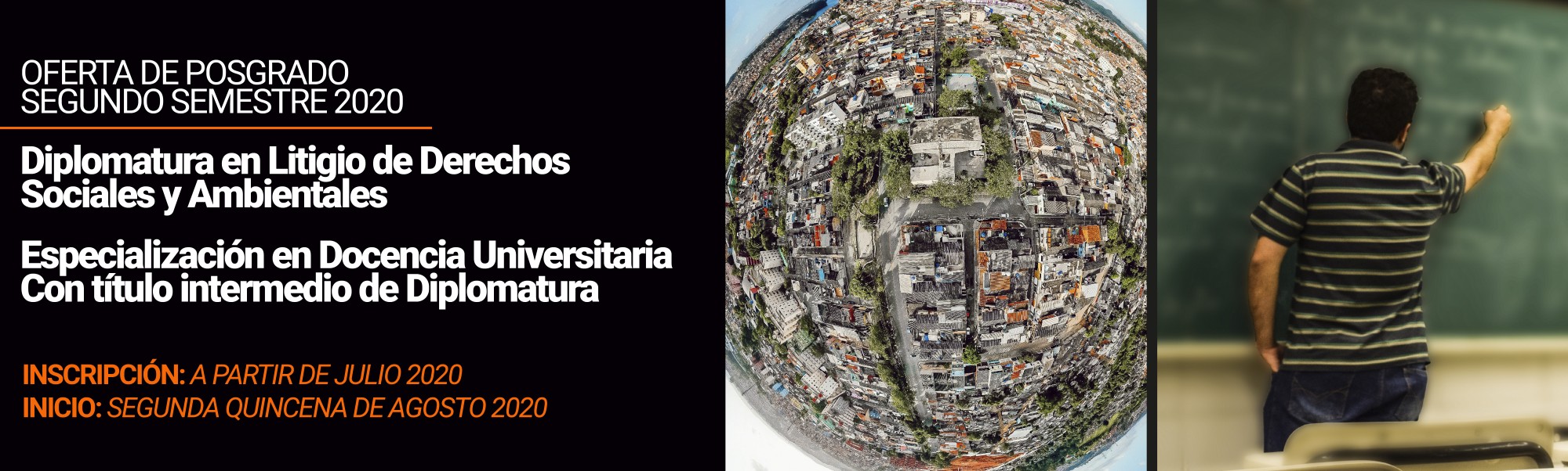 Diplomatura en Litigio de Derechos Sociales y Ambientales: Esta diplomatura procura asegurar la adquisición de conocimientos académicos del Litigio en Derechos Sociales y Ambientales, con especial hincapié en los aspectos prácticos, brindando herramientas para el litigio. Se pretende construir un espacio de formación, reflexión y trabajo, sobre los derechos sociales y ambientales, profundizando el estudio de los derechos humanos a partir de una síntesis entre la praxis, la doctrina y la jurisprudencia. La propuesta se desarrollará íntegramente en modalidad virtual. Más información aquí